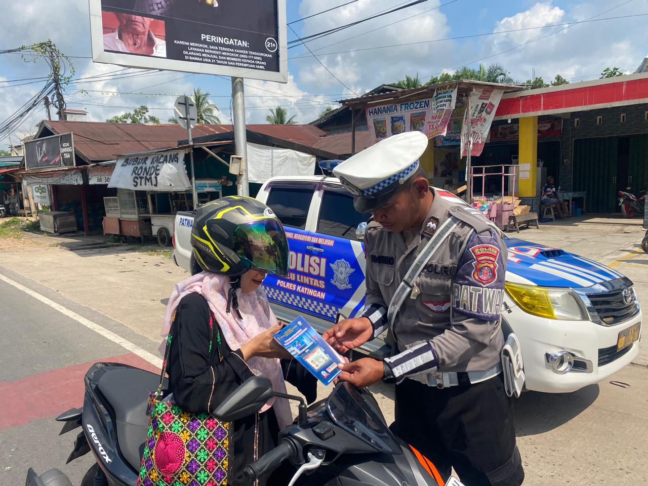 Personil Satlantas Polres Katingan sebagai anggota preemtif bergerak turun ke Jalan untuk meninformasikan kepada pengendara melalui pembagian brosur, untuk menciptakan keamanan dan keselamatan berlalu lintas.