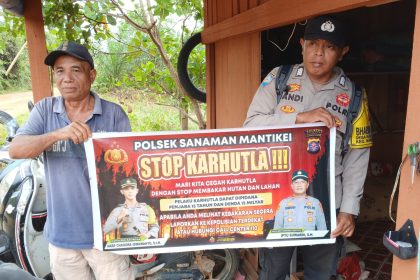 Polres Katingan- Personil Polsek Sanaman Mantikei melakukan sosialisasi larangan membuka hutan dan lahan dengan cara di bakar di wilayah Kecamatan Sanaman Mantikei, Minggu (05/10/2025). Kapolsek Sanam...
